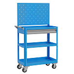 Корпус выполнен из листовой стали толщиной от 0,6 до 1,5 мм., покрыт полимерной порошковой краской. С перфорированной панелью для навесных элементов и выдвижным ящиком на шариковых телескопических направляющих. Общая равномерно-распределённая нагрузка на тележку - до 100кг. Верхняя и средняя полка имеют высоту борта 40 мм., нижняя полка имеет высоту борта 60 мм. Размер 950х800х450 мм.