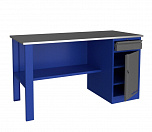 Однотумбовый. Допустимая нагрузка на столешницу 750 кг. Опорные элементы выполнены сварными из холоднокатаной стали. Верстак состоит из столешницы, опоры, тумбы P3 с тремя большими ящиками, полки-стенки и одинарного экрана с кронштейнами. Все металлические элементы покрыты полиэфирной порошковой краской. Столешница состоит из фанеры марки ФСФ толщиной 24 мм, которая покрыта лаком-антисептиком и листом оцинкованной холоднокатаной стали толщиной 1,2 мм. Размеры (ВхШхГ) 1470x1396x696 мм.