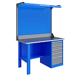 Однотумбовый. Допустимая нагрузка на столешницу 750 кг. Опорные элементы выполнены сварными из холоднокатаной стали. Верстак состоит из столешницы, опоры, тумбы P5 с четырьмя малыми и одним большим ящиком, полки-стенки, двойного экрана с кронштейнами. Столешница состоит из фанеры марки ФСФ толщиной 24 мм, которая покрыта лаком-антисептиком и листом оцинкованной холоднокатаной стали толщиной 1,2 мм. Размеры (ВхШхГ) 1965x1396x696 мм.