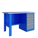 Однотумбовый. Допустимая нагрузка на столешницу 750 кг. Опорные элементы выполнены сварными из холоднокатаной стали. Верстак состоит из столешницы, поры, тумбы P4 с двумя малыми и двумя большими ящиками, полки-стенки и одинарного экрана с кронштейнами. Все металлические элементы покрыты полиэфирной порошковой краской. Столешница состоит из фанеры марки ФСФ толщиной 24 мм, которая покрыта лаком-антисептиком и листом оцинкованной холоднокатаной стали толщиной 1,2 мм. Размеры (ВхШхГ) 1470x1396x696 мм.