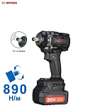 Гарантия 12 мес. Ударный. Профессиональный. До 890Нм. 3 скорости. Реверс. Квадрат 1/2". Белый светодиод подсветки. Индикатор заряда.  20В. (2х4Ач аккумулятора РАЗМЕР БОЛЬШЕ — ПРОСЛУЖИТ ДОЛЬШЕ!), кейс и зарядное устройство в комплекте. Бесщеточный двигатель. Антивибрационная ручка. Для слесарных работ и шиномонтажа.