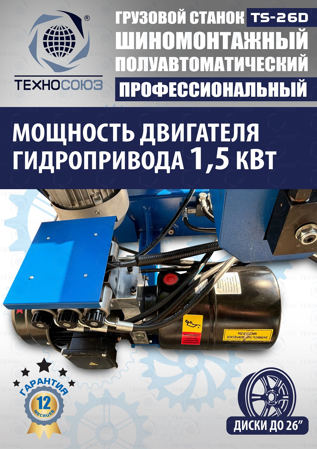 Очень качественный станок. Отказов и рекламаций нет!!! На станке установлены Моторы 1,5 + 2,2 кВт - конкурентов 1,5 + 1,8 кВт. В комплекте: Немецкий насос «Bucher hydraulics». Диски сталь, AL, с кольцами и без, 14÷26” с адаптерами 14÷42”(опция), Колесо макс. Ø1600 мм, позволяет делать колеса "спарку" с шириной колеса до 800 мм. Вес колеса до 500кг. Отжим min-max. 2500-6300 кг. Для грузового шиномонтажа автомобилей, автобусов, дорожной техники, сельхозмашин.