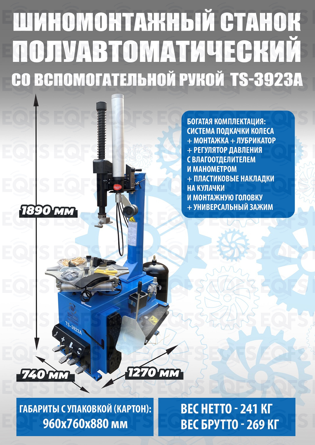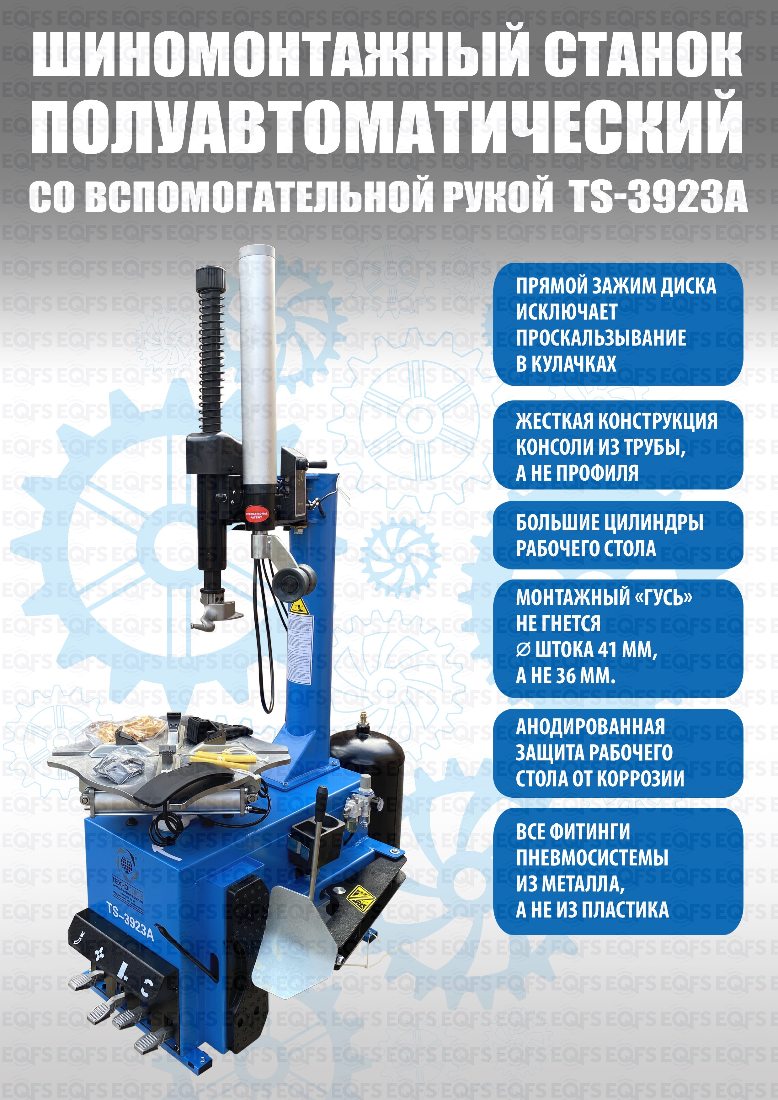 Шиномонтажного полуавтоматического станка TS-3923A для колес легковых автомобилей, легких грузовиков. Для дисков: 12÷24”. В комплекте: вспомогательная рука для работы с низкопрофильными шинами и RanFlat + встроенный бустер 24 литра (взрывная подкачка) + пистолет для подкачки шин + монтажка + регулятор давления с влагоотделителем и манометром.