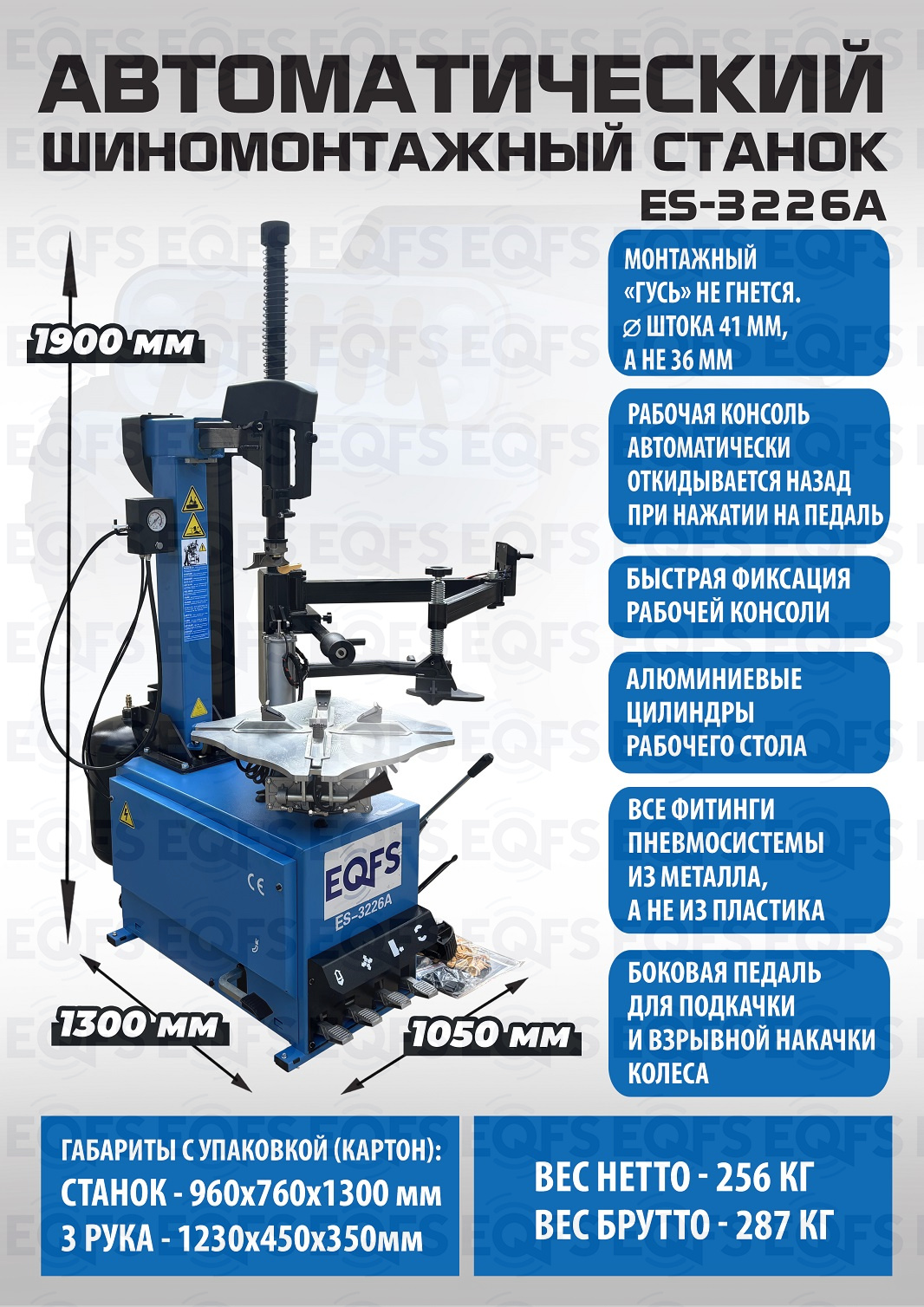 ES-3226A шиномонтажный станок Автомат. Взрывная подкачка, «третья рука» для работы с низкопрофильными шинами и RanFlat в комплекте. Диски: внешний зажим 11÷21", внутренний 12÷24". Для покрышек легковых автомобилей, внедорожников, «Спринтеров», «Газелей» и т.п.
