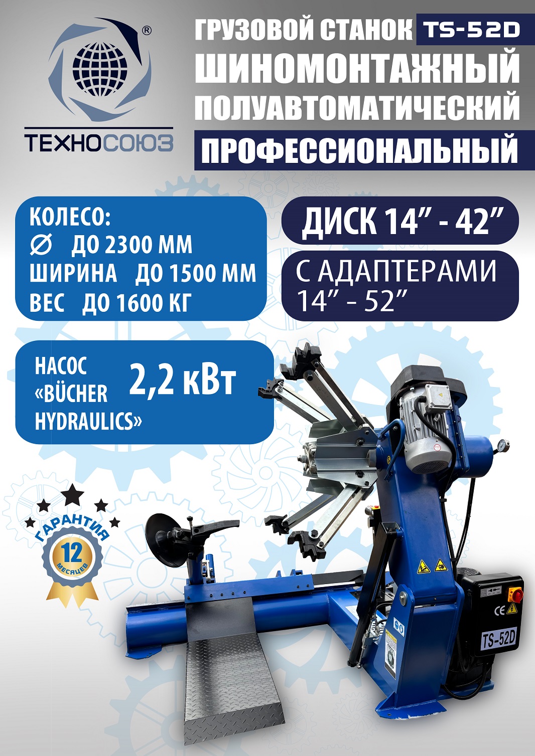 Комплект из TS-52D грузового шиномонтажного станка для дисков 14”-42”, с удлинителями на захваты до 52” - очень качественный станок. За последние 9 лет ни одной рекламации!!! Диски сталь + ALU Ø 14÷42” с адаптерами 14÷52”(опция). Автомат. Максимальное колесо Ø2300 ширина1050мм, вес до 1600кг. Моторы 2,2 + 2,2 кВт, 380В. Гарантия 12÷18мес. Гидронасос «BUCHER HIDRAULICS». Cтанок подходит для тракторов, сельхозтехники, еврофур и т.п. + ЛС-32 MAXY P Универсальный грузовой балансировочный станок для колес диаметром от 10 до 30 дюймов, имеет две программы для работы с легковыми и грузовыми колесами. Максимальный вес колеса до 200 кг. Оснащен функциями автокалибровки и самодиагностики.В стандартный комплект входит набор конусов для установки колес легковых автомобилей, микроавтобусов и легковых грузовиков типа "Газель", а также универсальный адаптер для установки колес большинства типов грузовых автомобилей. Для установки тяжелых колес ЛС 32 MAXIP комплектуется подкатной тележкой с пневматическим подъемным механизмом. Внесен в реестр средств измерений России Казахстана и Респ. Беларусь