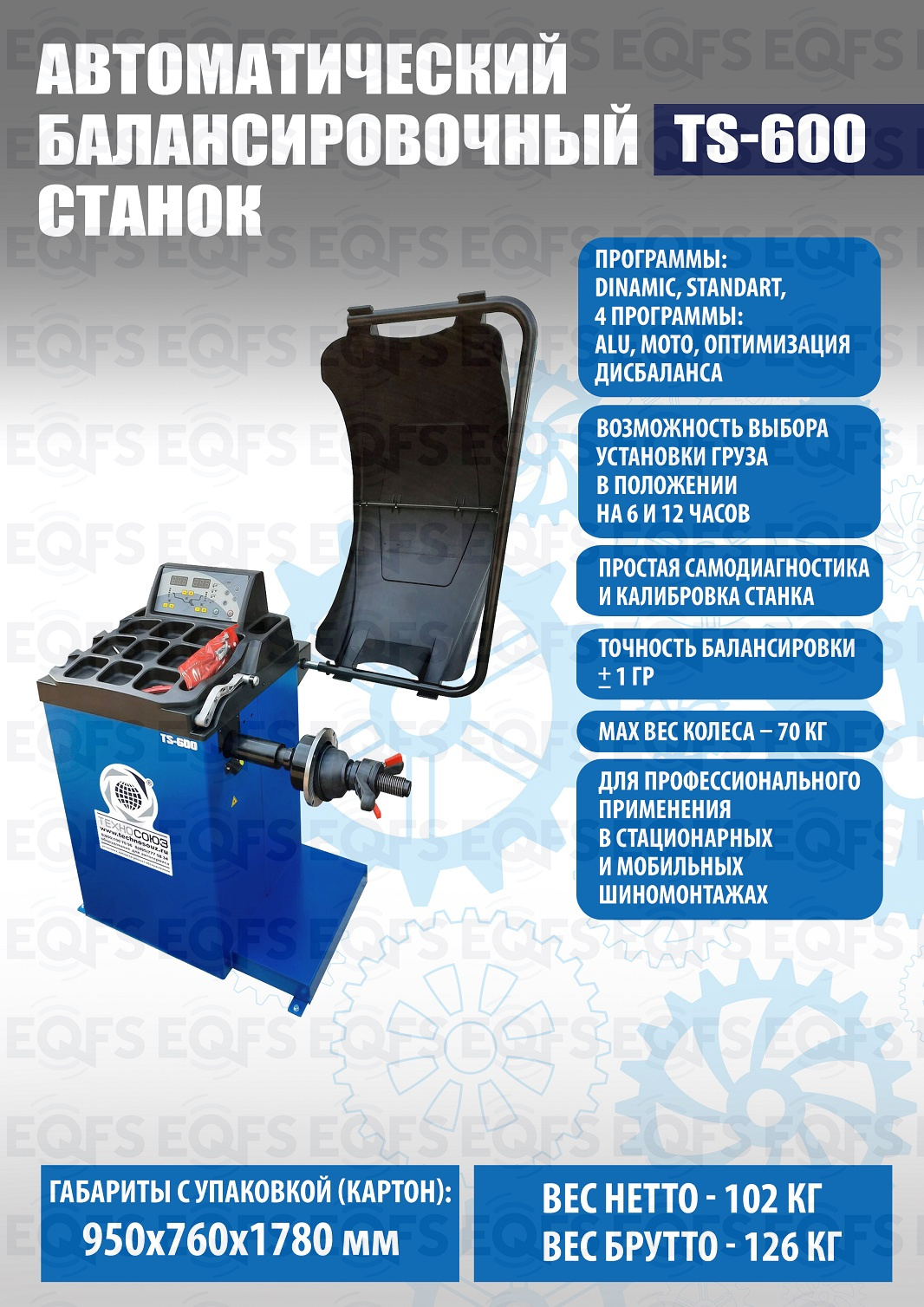 TS-600 Автоматический балансировочный станок. Автоматический ввод дистанции и диаметра диска. Остановка и фиксация колеса в месте установки грузика. Лазерная указка места установки грузика на 6 часов. Старт опусканием кожуха или с кнопки. Для колес легковых автомобилей, мотоциклов и легких грузовиков с диаметром диска с резиной до 800 мм. Размеры диска: ширина 3–10” (76-254 мм), диаметр диска 10–24” (254÷609 мм). Вал- 40мм. Гарантия 18 мес – наш монтаж, 12 мес – самостоятельная установка. В комплекте: кожух с автозапуском + клещи + кронциркуль + быстрозажимная гайка + набор конусов.