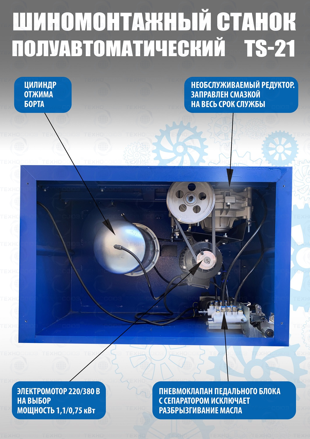 Полуавтоматического шиномонтажного станка TS-21 предназначен для монтажа и демонтажа колес легковых автомобилей, джипов и коммерческой техники. Для дисков: внешний 11÷18”, внутренний 12÷20”. В комплекте: пистолет для подкачки шин + монтажка + пластиковые накладки на зажимные кулачки + регулятор давления с влагоотделителем и манометром. Рекомендуется для постов со средней и высокой проходимостью.