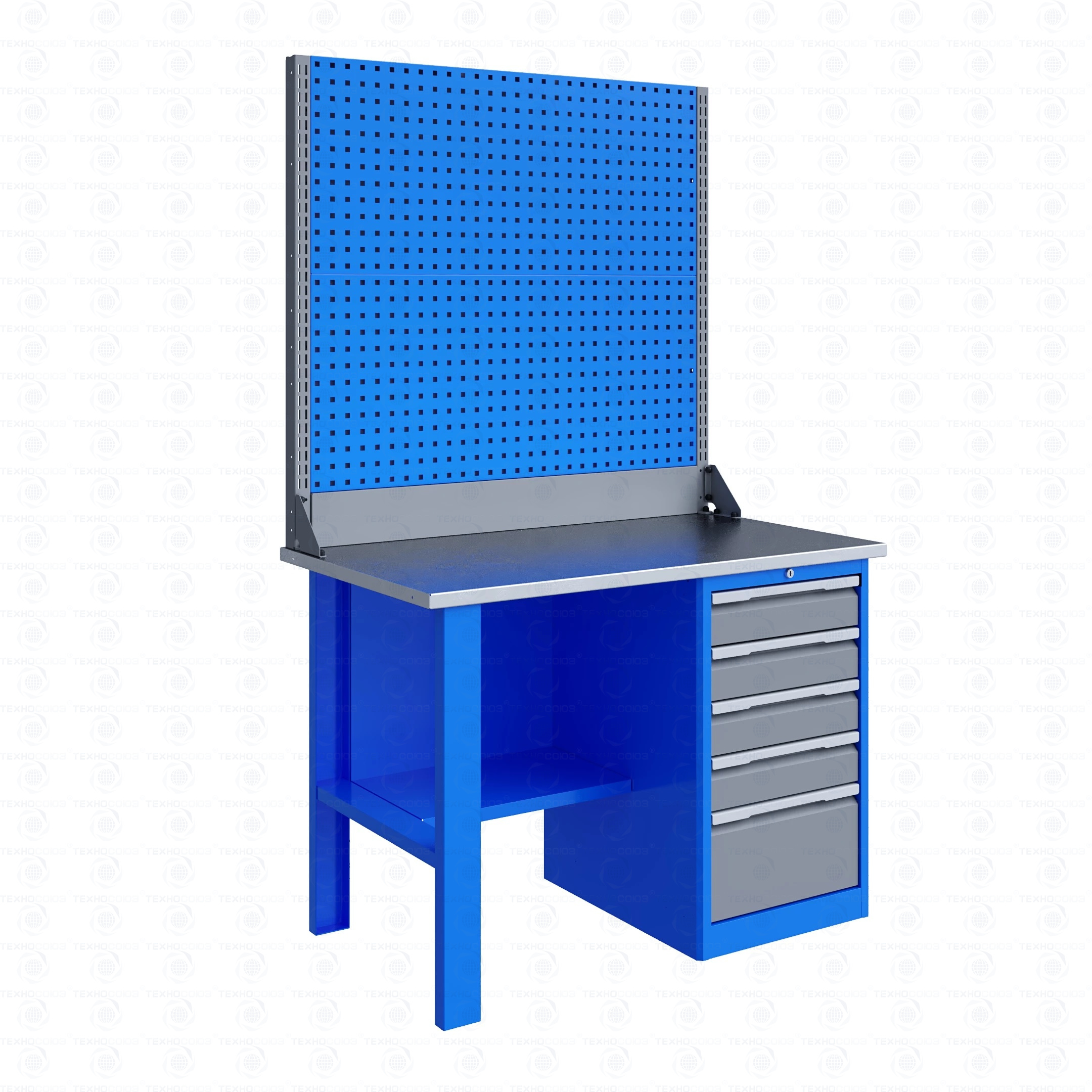 Тумба верстака - сварная. Ящики в тумбе устанавливаются на шариковых телескопических направляющих полного выдвижения. В тумбе P5 установлено четыре малых и один большой ящика. Внутренние размеры малых ящиков (ВхШхГ), не более: 103 х 397 х 520 мм. Внутренние размеры больших ящиков (ВхШхГ), не более: 222 х 397 х 520 мм. Тумбы с ящиками снабжены общим центральным замком с поворотом ригеля 180 градусов и подпружиненной тягой. В комплекте два ключа.